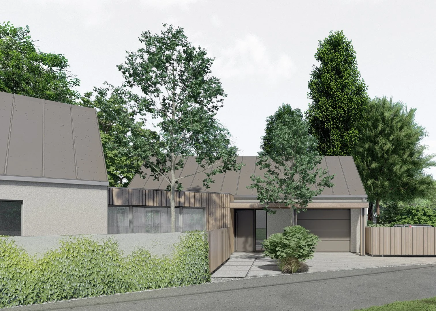 Tvar domu je navrhnutý tak, aby harmonizoval s okolitou zástavbou, pričom zachováva moderný a funkčný štýl. Denná zóna, ktorá zahŕňa obývaciu izbu a jedáleň, spolu s ostatnými obytnými miestnosťami, je orientovaná na juh a západ. Táto orientácia zaručuje dostatok prirodzeného svetla počas celého dňa, čo prispieva k príjemnému a svetlému prostrediu v interiéri.