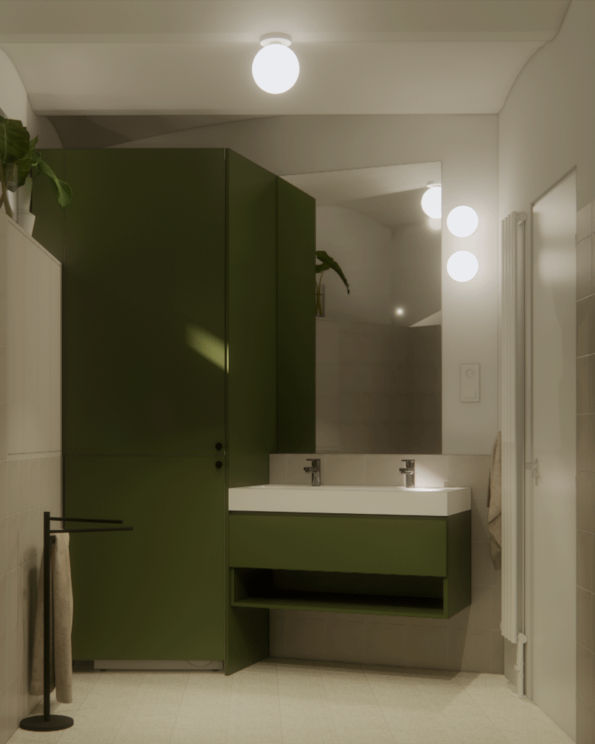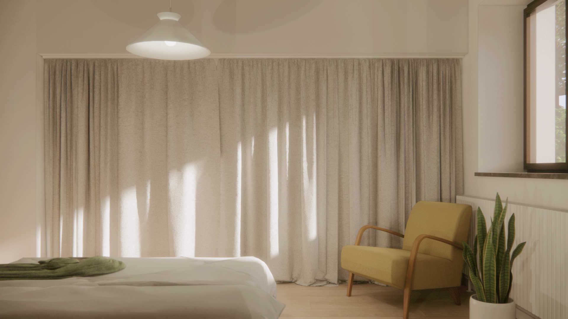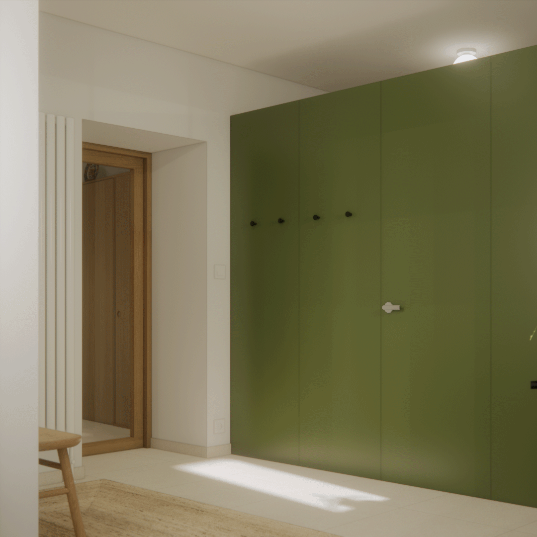 Výrazným prvkom rekonštrukcie je farebné a materiálové riešenie, ktoré reflektuje umelecké zameranie objektu a podčiarkuje charakter maliarovej tvorby. Dominantnými farbami v interiéri sú svetlý drevodekor a dubová dýha, ktoré sú kombinované so zeleným a oranžovým laminátom. Materiálové riešenie vstavaného nábytku dopĺňa výber podláh: bledé terrazzo vo vstupnej hale a hygienických priestoroch, tehlová dlažba v kuchyni, drevený vzor v obytných častiach a jemný sivý vinyl v ateliéri.