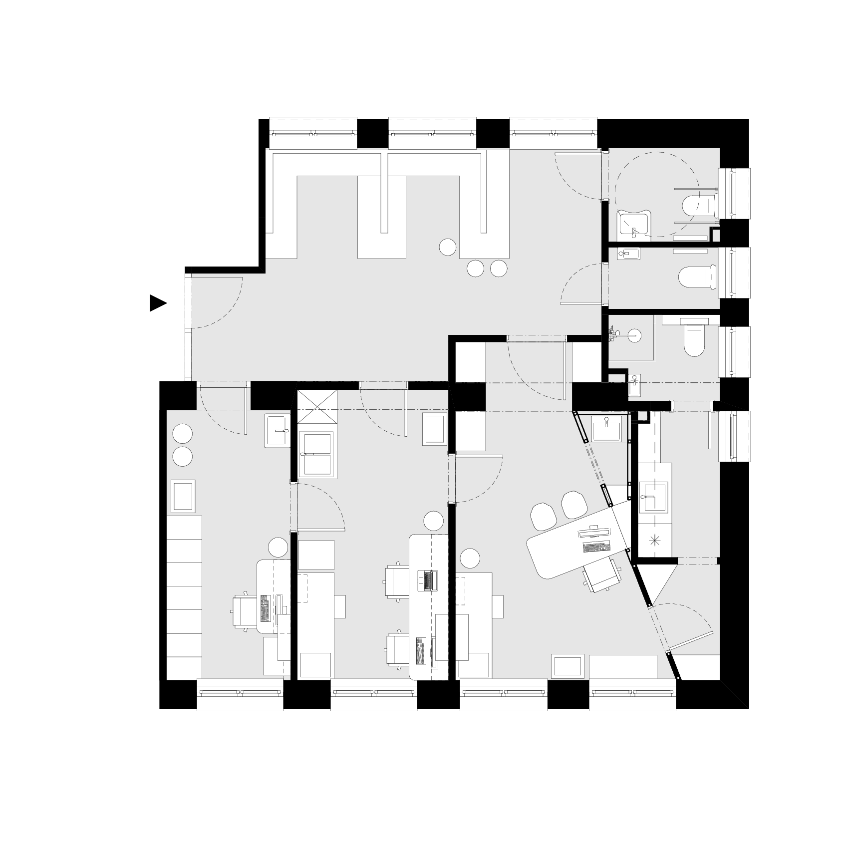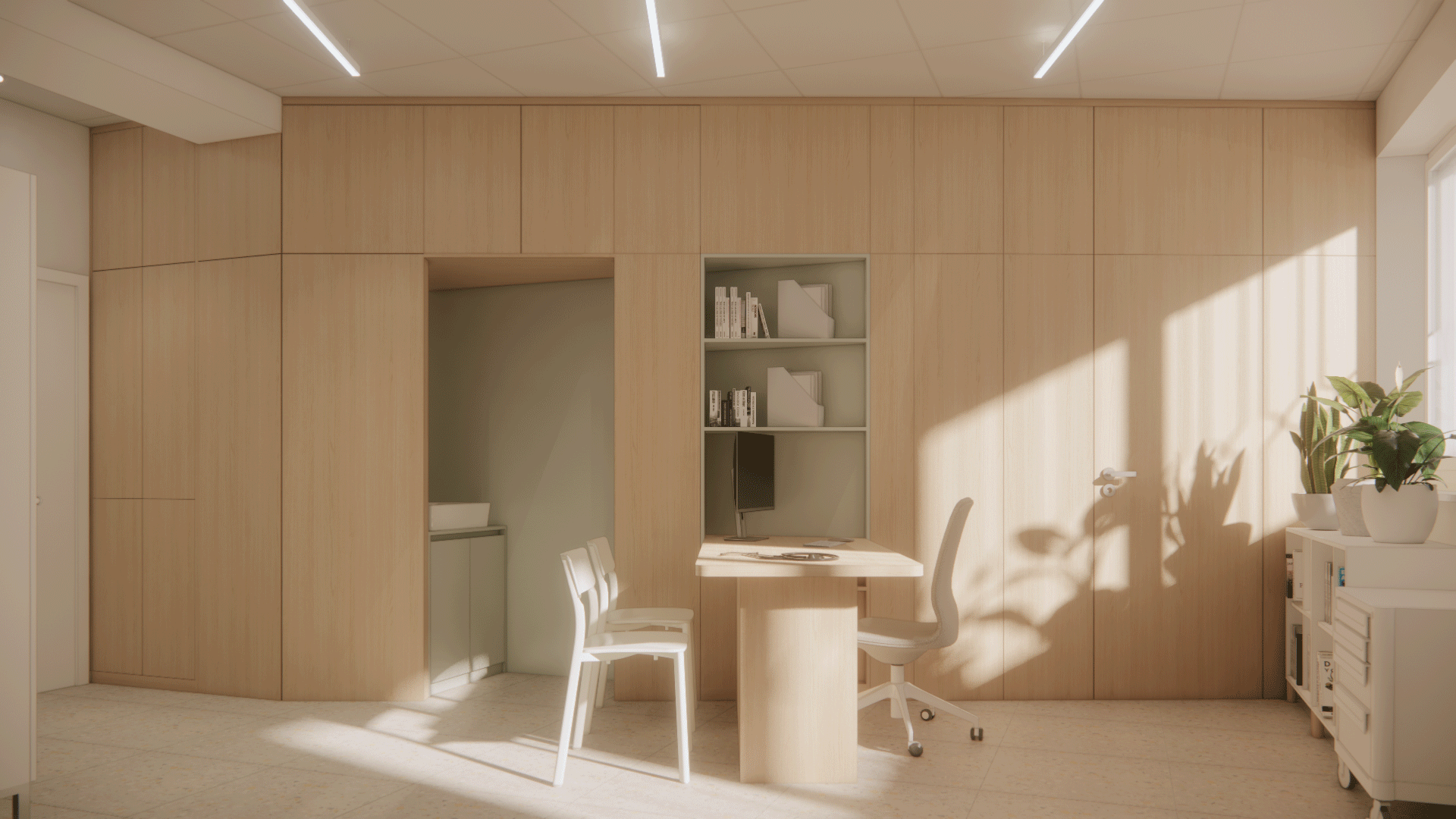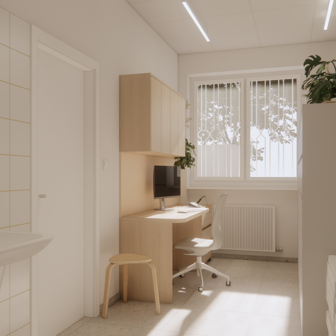 Vstup do čakárne je zabezpečený cez spoločné priestory polikliniky. Z čakárne sú prístupné všetky tri ambulancie, ktoré sú medzi sebou prepojené, čo zabezpečuje flexibilitu a prepojenosť priestorov. Prístup personálu do jednotlivých ordinácií je totožný s prístupom pacientov. Ambulancia lekára je oddelená šikmou nábytkovou priečkou a prepojená so zázemím pre zamestnancov, čím sa vytvára vizuálny aj funkčný filter medzi ordinačným priestorom a dennou miestnosťou personálu.