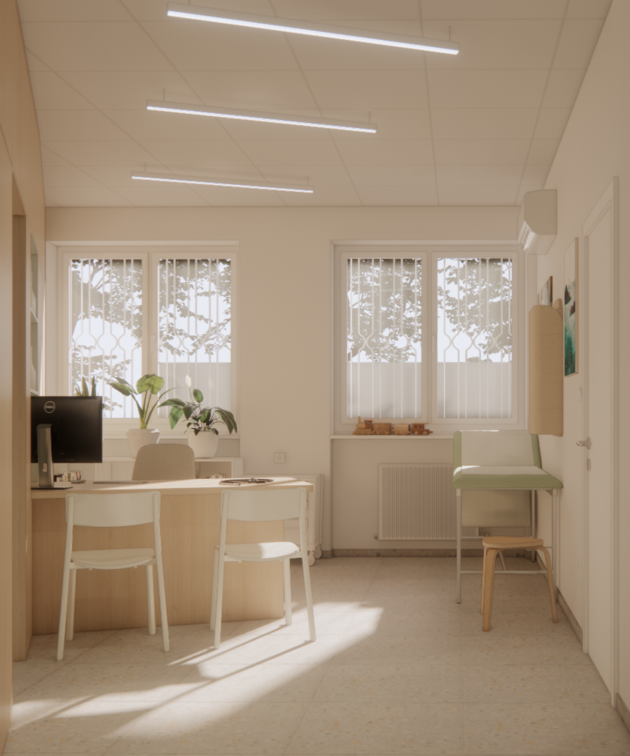 Priestor navrhovanej detskej ambulancie sa nachádza v budove zdravotníckeho strediska, ktoré v súčasnosti prechádza komplexnou rekonštrukciou. Priestory zahŕňajú čakáreň so zázemím pre pacientov, tri samostatné ambulancie s nezávislými vstupmi, ktoré sú zároveň prepojené, čo umožňuje efektívnu cirkuláciu.