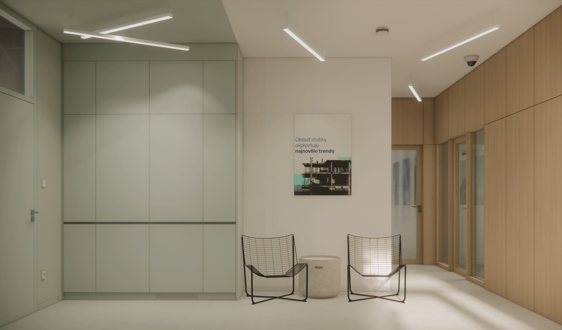 Koncept vychádzal zo zamerania kancelárie ako statikov. Objavuje sa tu výstužová oceľ, z ktorej vytvárame oporné konštrukcie pre rastliny. Farebné riešenie vychádza z farieb firmy – svetlá mentolová farba, ktorá sa objavuje v logu BVK-pro, vytvára hlavný farebná akcent a priestorom dodáva hravosť. Osvetlenie sme navrhli formou zavesených líniových lámp, ktoré sme striedavo pootáčali. Dôležitým motívom je aj zeleň, ktorá púta pri hlavnom vstupe do objektu a taktiež sa objavuje ako deliaci prvok medzi pracovnými stolmi. Použité materiály zároveň farebne delia vstupnú časť – zelená farba sa objavuje pri kuchynke a chill zóne a obklad v svetlom drevodekore sa líniovo tiahne naprieč celým vstupným priestorom.