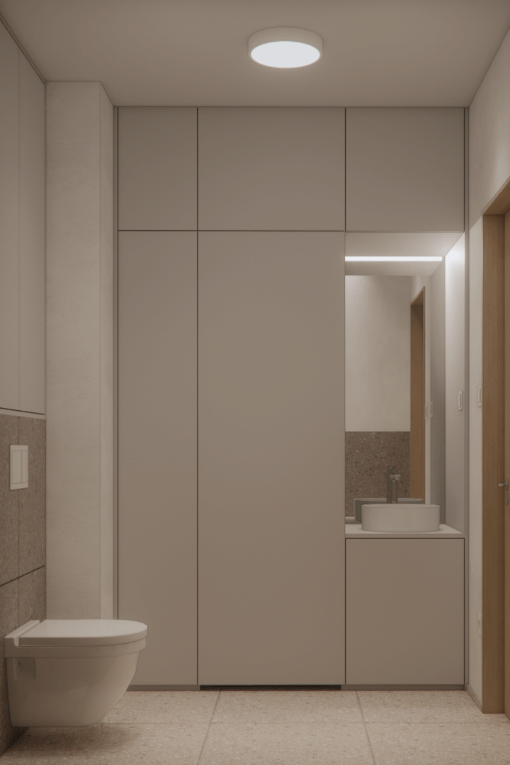 Potenciál bytu sme maximálne využili cez vstavané nábytky, ktoré svojou farebnosťou vytvárajú jedinečnú identitu bytu a zároveň spĺňajú požiadavku pre dostatok úložného priestoru. Zo zádveria sa vstupuje do spálne a zároveň sa otvára do presvetlenej chodby, ktorá opticky prepája obývačku s kuchyňou.