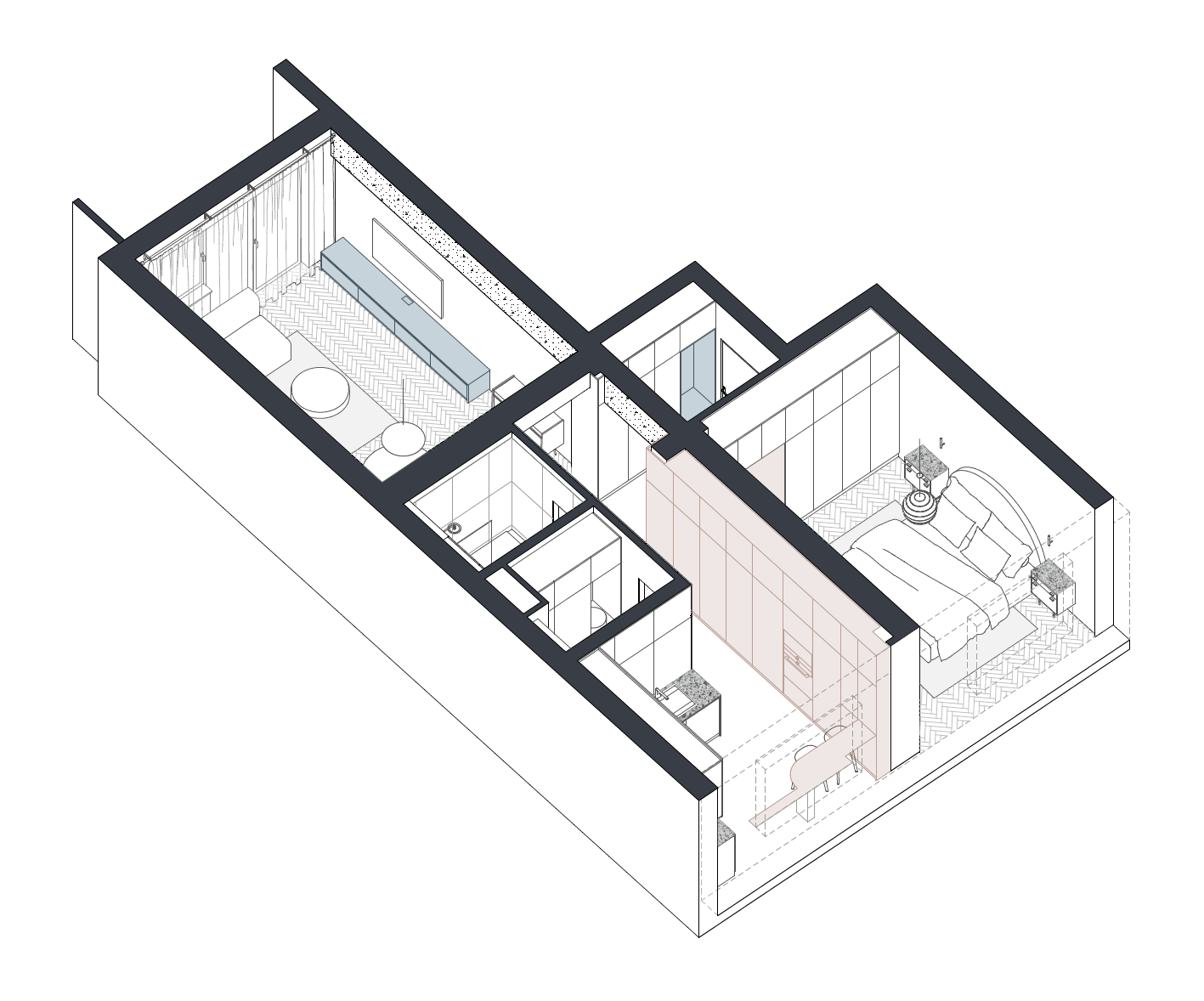 Pôvodnú pomerne uzavretú dispozíciu sa podarilo odstránením časti stavebných prvkov očistiť a prevzdušniť. Odstránením priečok v kuchyni a obývacej časti vznikajú priehľady naprieč dennou časťou bytu, čo ho značne presvetlilo a opticky zväčšilo. Pôvodnú niku na chodbe, kde bola umiestnená vstavaná skriňa, sme rozšírili smerom do kuchyne, čím sa priestor lepšie využil a zefektívnil. Hygienické jadro sme „obalili“ do dreveného obkladu, čo vytvára akési jadro bytu. Tento obklad sa prejavil aj v kuchyni a v obývacej časti. Pôvodným zámerom bolo prebúranie priečok medzi WC, pomerne malou kúpeľňou a špajzou, no kvôli existujúcim vetracím potrubiam v priečkach tento zásah nebol možný. Bola teda odstránená priečka medzi špajzou a WC, kde vzniklo priestranné WC s práčovňou. Kúpeľna ostala vo svojej pôvodnej pozícii a celé jadro sa mierne rozšírilo do chodby. Týmito stavebnými zásahmi sme dosiahli požiadavky klientky byt čo najviac presvetliť.