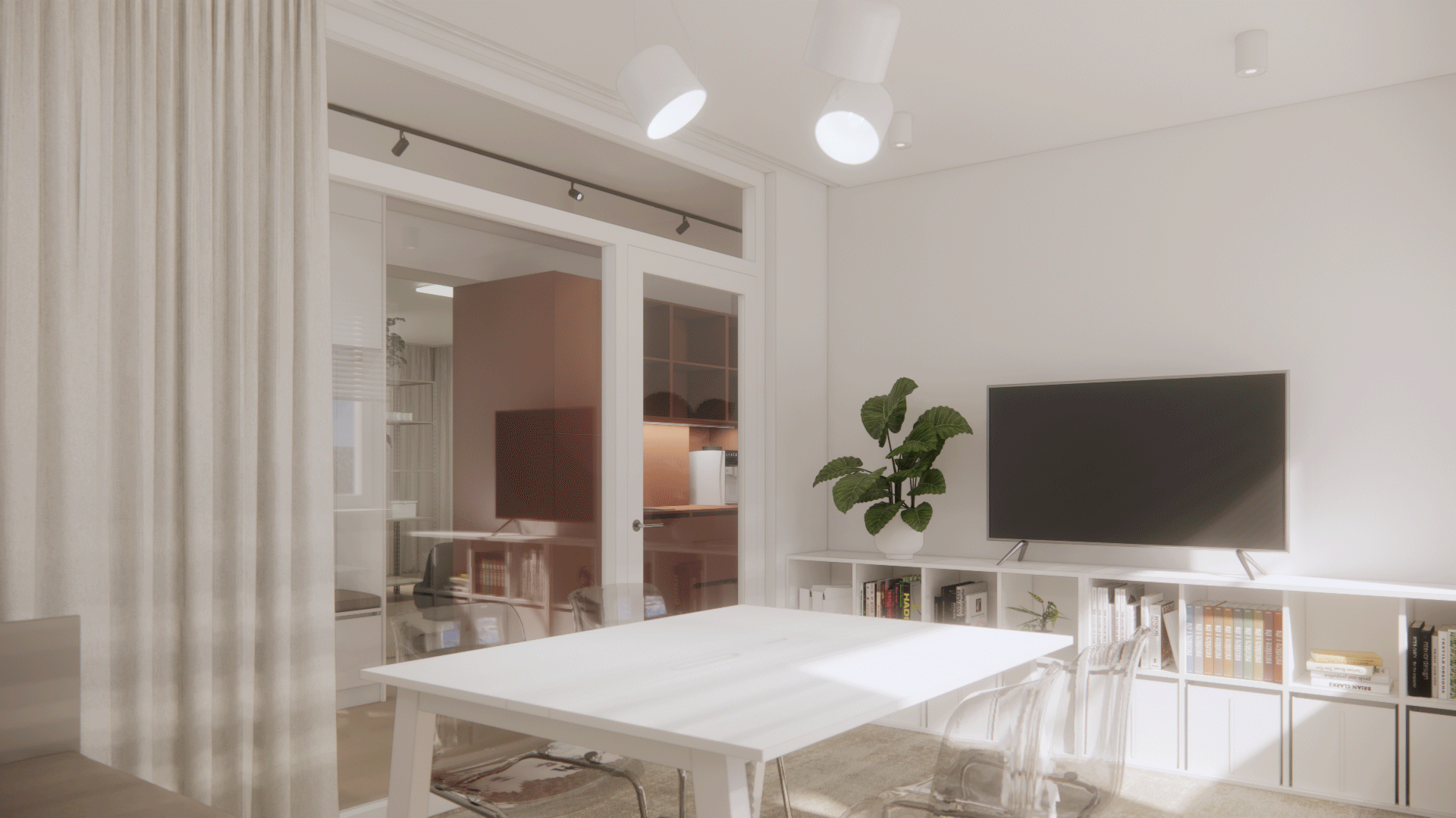 V kancelárii ponechávame policové regály z bývalej predajne v ich pôvodnej farebnosti v kombinácii s bielymi stolovými doskami. Zeleň v interiéri nielen esteticky obohacuje priestor ale aj funkčne prispieva k zlepšeniu kvality vzduchu v priestoroch. Rastliny prirodzene zvlhčujú vzduch a distribujú kyslík, čo vytvára zdravšie a príjemnejšie prostredie pre prácu. V zadnej časti dispozície sa nachádza expedičná miestnosť a hygienické zázemie, ktoré spĺňa všetky nároky na komfort a hygienu. Tento funkčný a estetický dizajn tak zabezpečuje nielen efektívne pracovné podmienky, ale aj príjemné a zdravé prostredie pre zamestnancov.